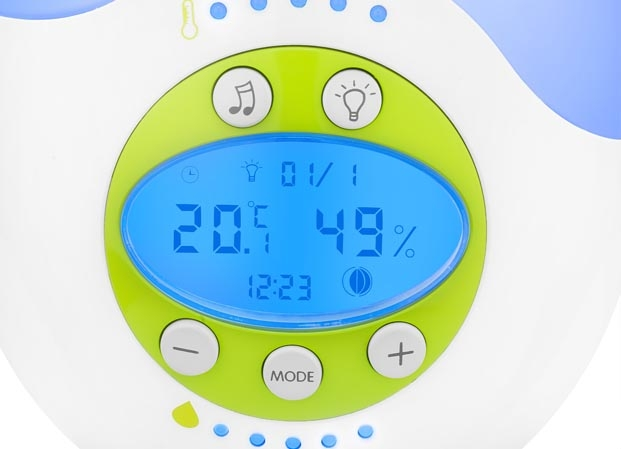 Tout comme une station météo, la station Bien-être vous donne toutes les informations concernant la température et le taux d'hygrométrie dans la pièce de bébé. Grâce à son écran LCD rétro-éclairé bleu et un système de diodes, vous pouvez voir en un clin d'oeil si la qualité de l'air est idéale (5 diodes allumées), moyenne (3 diodes allumées) ou critique (1 diode allumée).