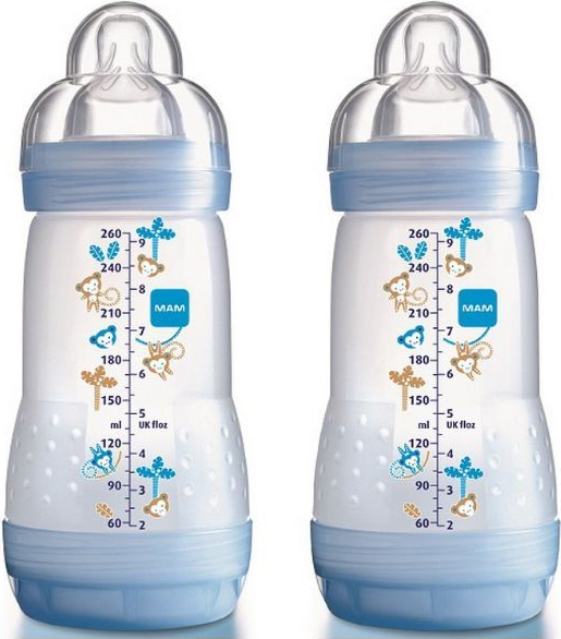 Ce coffret contient deux biberons MAM anti-colique de 260ml et deux tétines débit 2m+ (débit moyen).