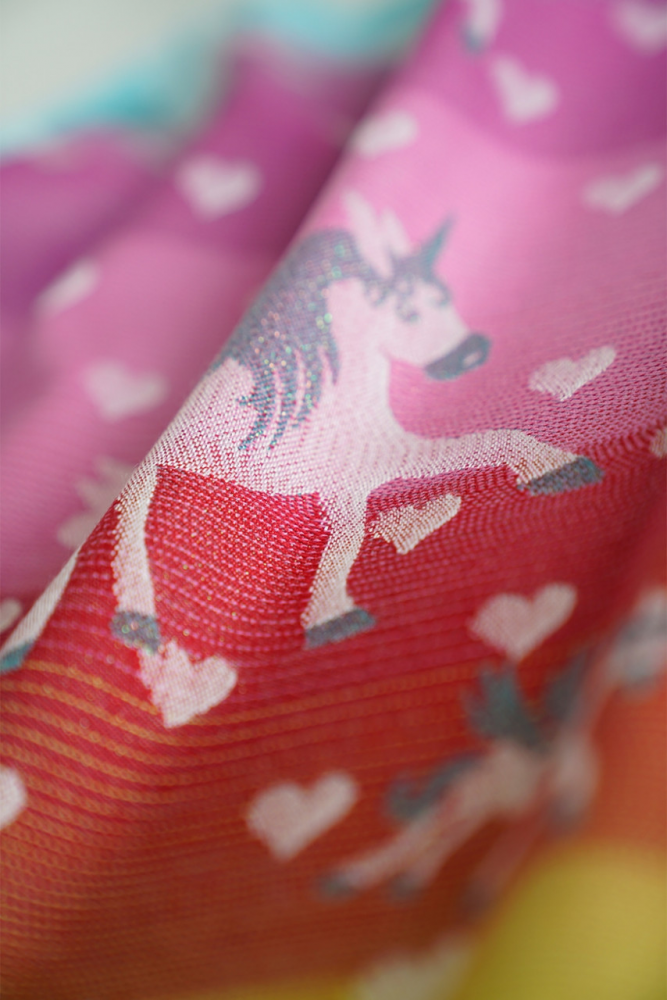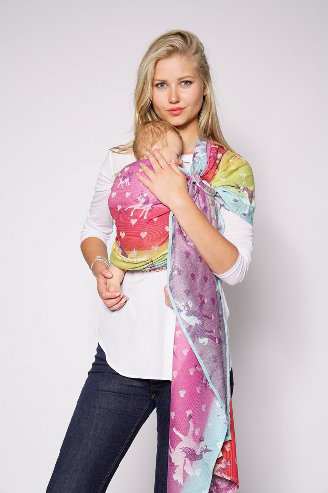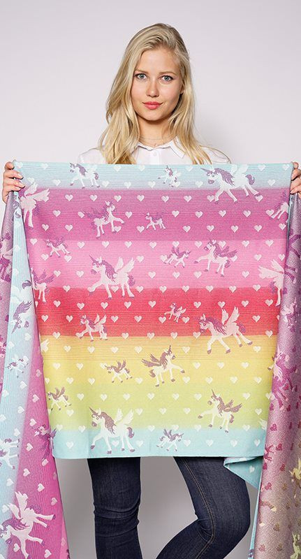 Cette écharpe de portage très colorée plaira à coups surs aux parents fans de licornes et d'arc-en-ciel.