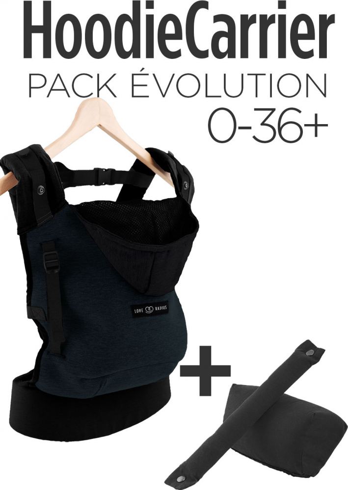 Le pack Bundle HoodieCarrier Black Forest + Booster Noir de Love Radius (Je Porte Mon Bébé) est un porte-bébé tout-en-un qui accompagnera votre enfant de la naissance jusqu'à 3ans.