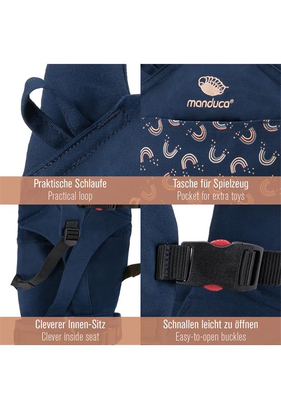 Le porte-poupon Manduca Arc-en-Ciel de Minuit est le cadeau parfait pour que votre enfant puisse développer son imagination et son autonomie en prenant exemple sur ses parents.