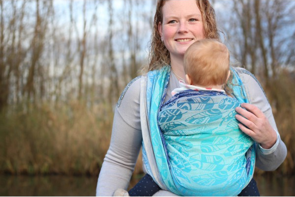 Le Ring Sling Four Winds Aqua Grad Natural Hemp de Yaro est une écharpe à anneaux très facile et rapide à installer.
