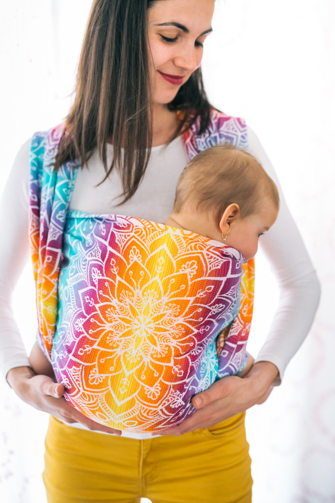 Le Ring Sling Mandala Irisé multi-color de Be Lenka nous vient tout droit de Slovaquie et est une écharpe à anneaux toujours prête à l’emploi et très rapide à installer.