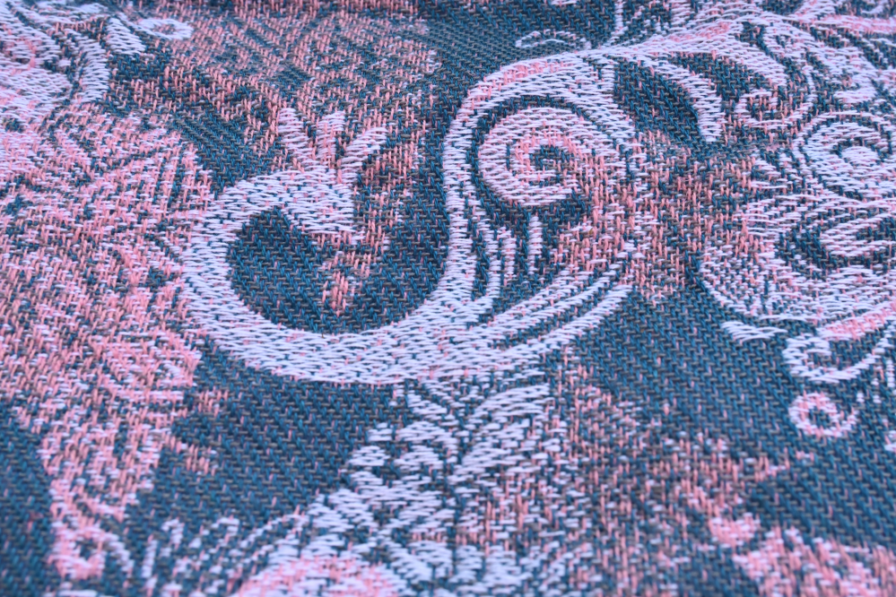 Le Ring Sling Yaro Peacock Trinity Rose Petrol Modal Linen est une écharpe de portage à anneaux tissé en Trinity Weave qui permet de magnifier le motif Paon avec des détails et une douceur inégalée.